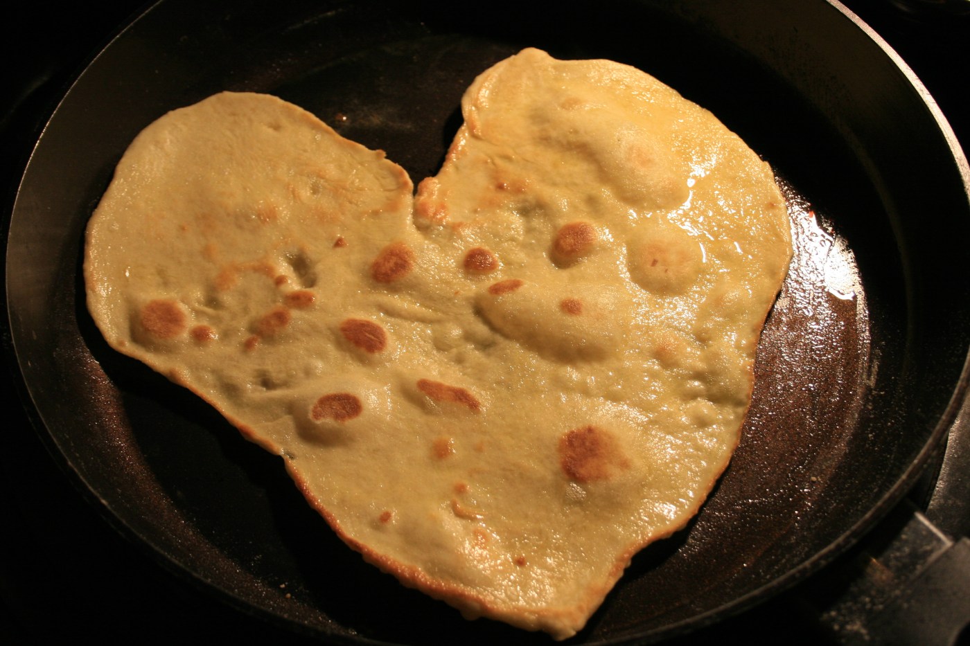 Die Pfanne mit dem Öl erhitzen. Das Öl muss richtig heiss sein. Ein Stückchen vom Teig nehmen und so dünn wie möglich ausrollen (Größe sollte in die Pfanne passen). Bevor das Öl zu rauchen beginnt, den Fladen in die Pfanne geben. Der Fladen wirft Bläschen. Sobald er unten braun und knusprig ist, wenden. Ein Fladen braucht ca. 3 Minuten in der Pfanne.